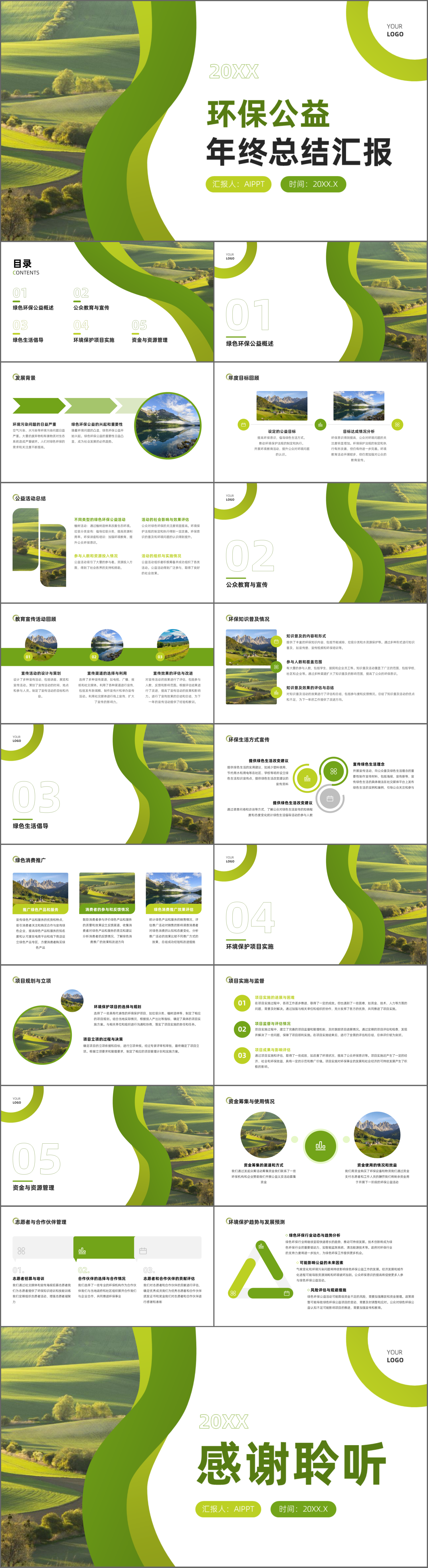 爱设计作图提供海量精美设计模板《绿色环保公益年终总结PPT模板》适用于 环保公益 , 通用 , 点击立即使用,通过拖,拉,拽迅速出图。 《绿色环保公益年终总结PPT模板》设计风格 商务科技 为,适用于 总结汇报 用途,主要配色为 绿色 。编辑完成点击下载,立即得到您满意的配图。
